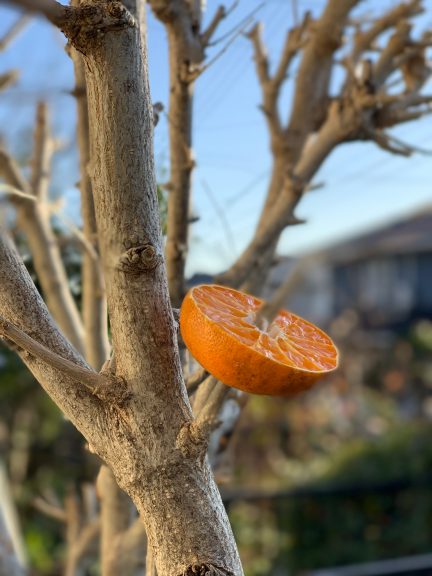 実家にて、庭先にある木槿にみかんが突き刺さしてありました。