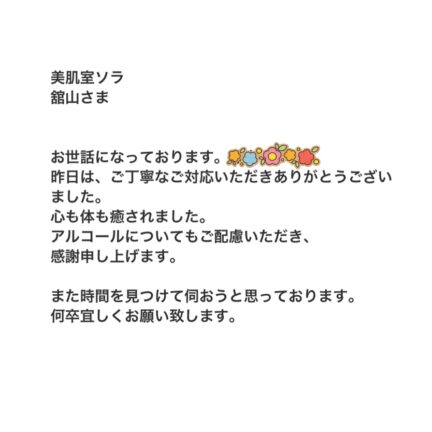 お客さまから事前にご連絡いただいておりましたので、アルコール(エタノール)不使用の化粧品でトリートメントさせていただきました。